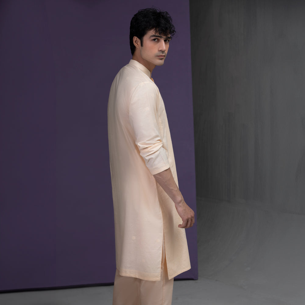 Pastel peach cotton jacquard kurta with phenomenal self weaves going on the front, sleeves and collar. It's a departure from run of the mill embroideries. Super light weight and understated elegance makes this a excellent choice for any event.